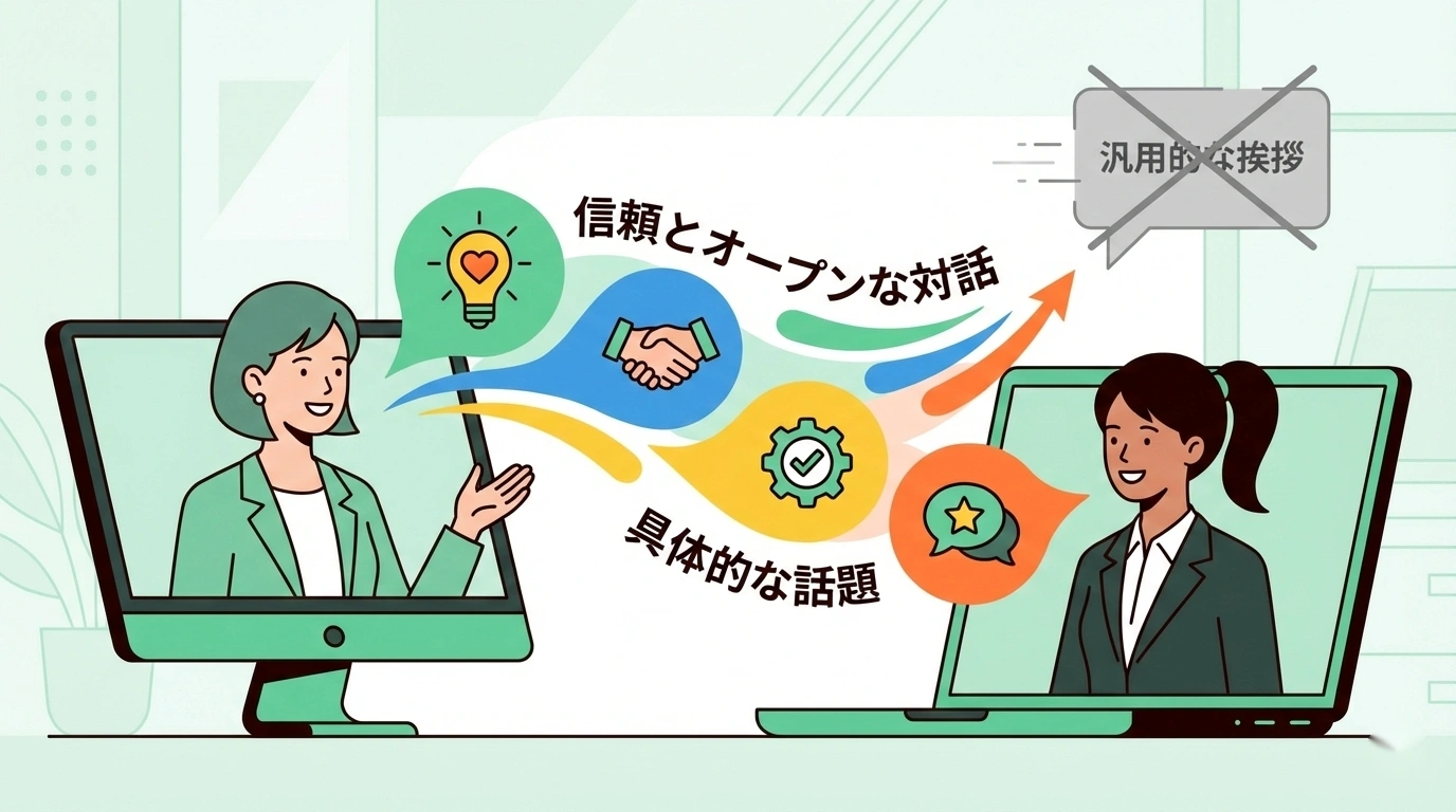 リモートワーク環境では、1on1が唯一の直接対話の機会になっているケースが多くあります。だからこそ、その貴重な時間の一部をあえて雑談に使うことが、長期的な信頼関係の構築につながるのです。