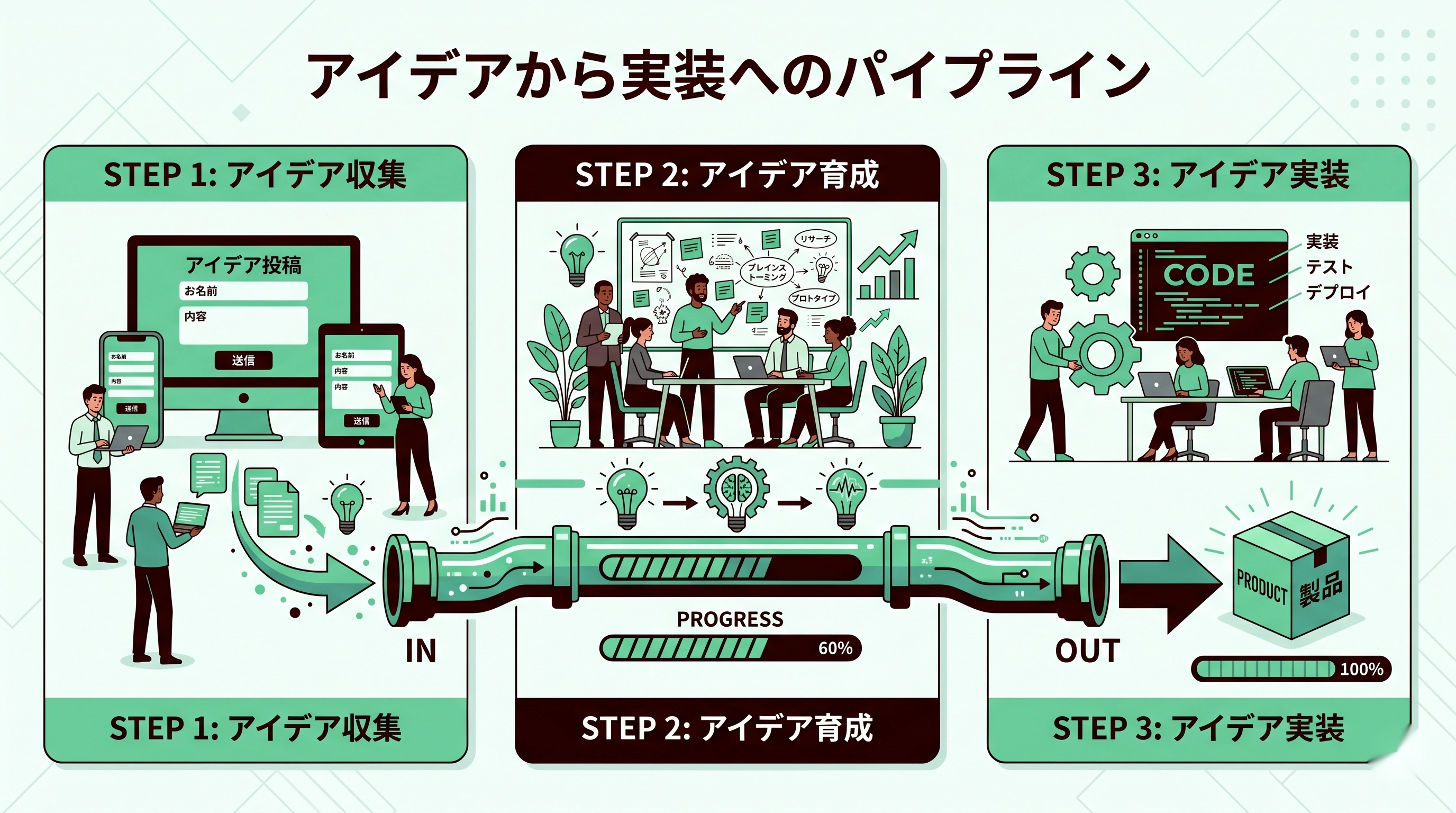ボトムアップ・イノベーションは、号令や制度だけでは生まれません。提案を「集める・育てる・実装する」の3フェーズで仕組み化することが鍵となります。要点は次の通りです。
