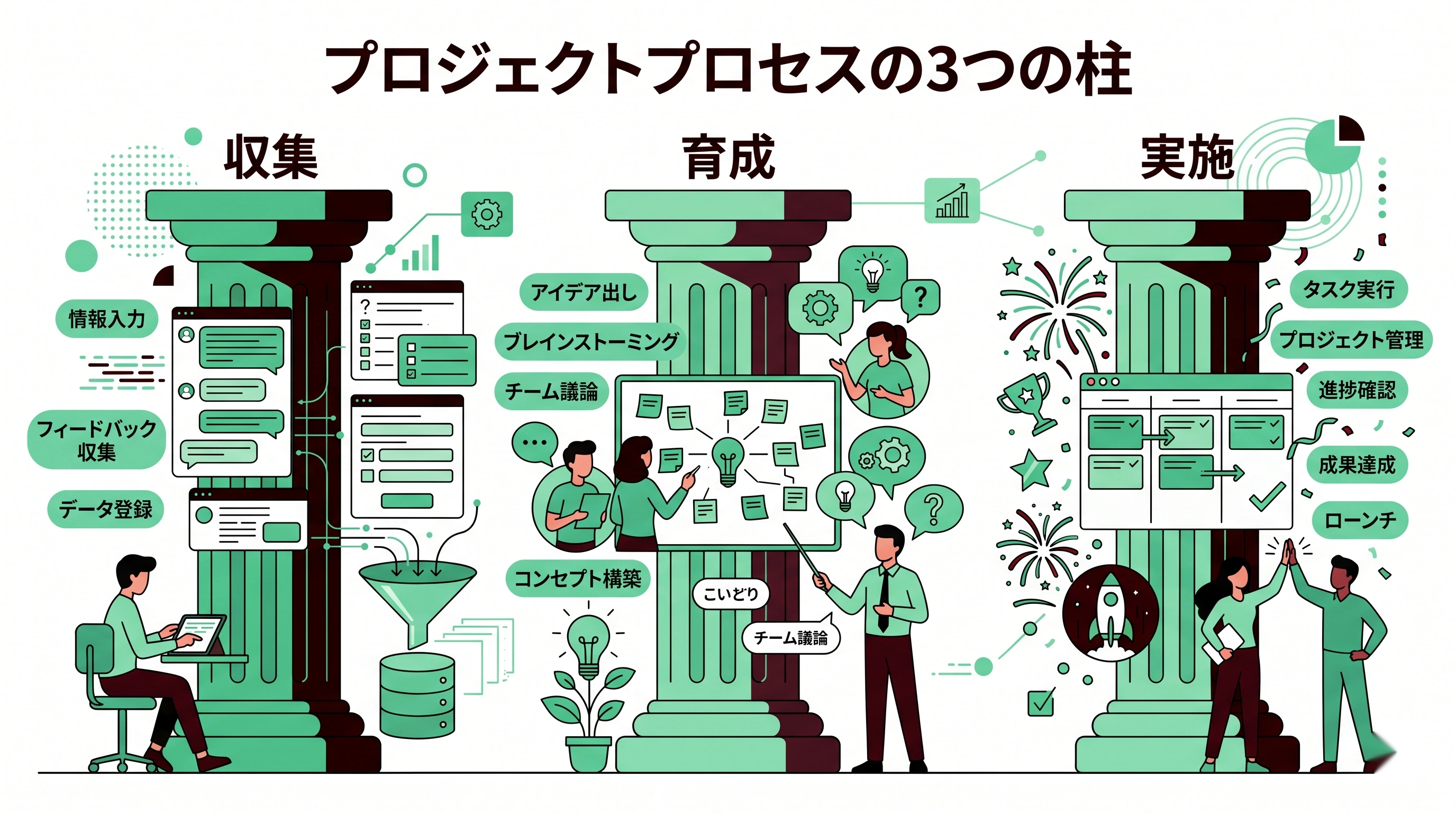 提案制度を設計するなら、「集める」「育てる」「実装する」の3フェーズで考えるのが効果的です。それぞれのフェーズに適したツールがあり、組み合わせ方ひとつで提案文化の根付き方が大きく変わります。
