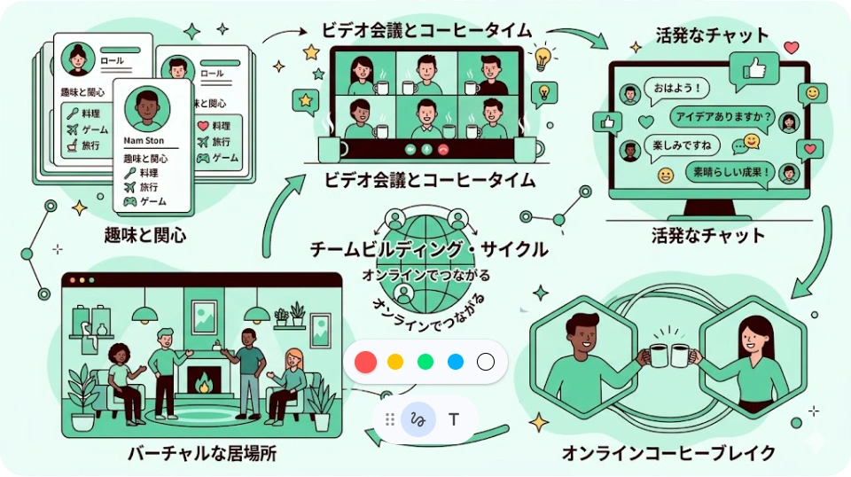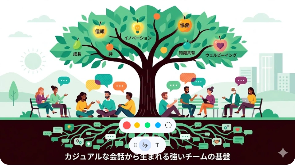 リモートワーク時代において、雑談は「自然に起きるもの」ではなく「設計するもの」です。会議冒頭のチェックイン、雑談チャンネル、バーチャルコーヒーチャット、ゆるいオンライン空間、プロフィールの可視化——これらの仕組みを一つずつ取り入れてみてください。