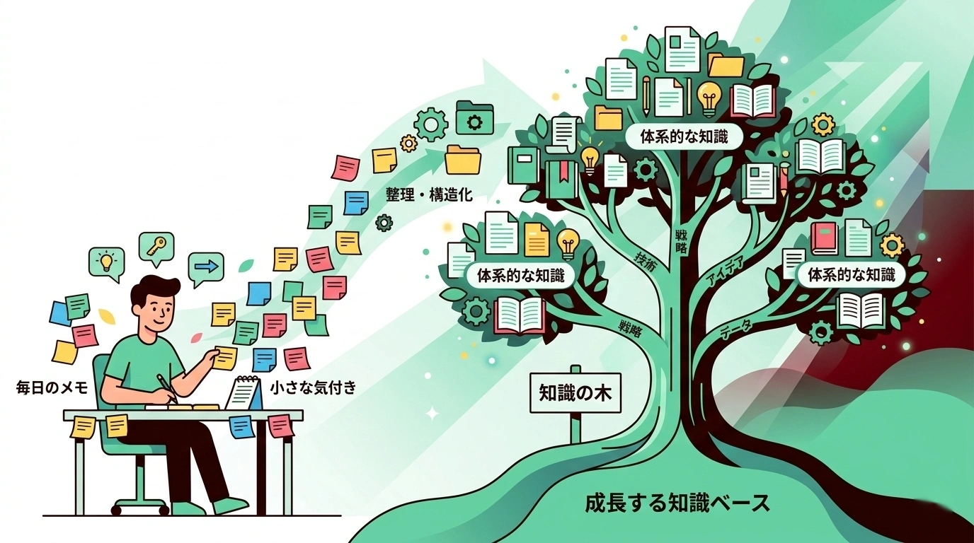 そうではなく、まずは日々の業務の中で「小さな記録」を積み重ねることから始めましょう。日報に一行メモを残す。チャットで共有した手順をコピーして保存する。口頭で教えたことを箇条書きにする。そんな「5分でできること」の積み重ねが、やがて組織の知的資産になっていきます。