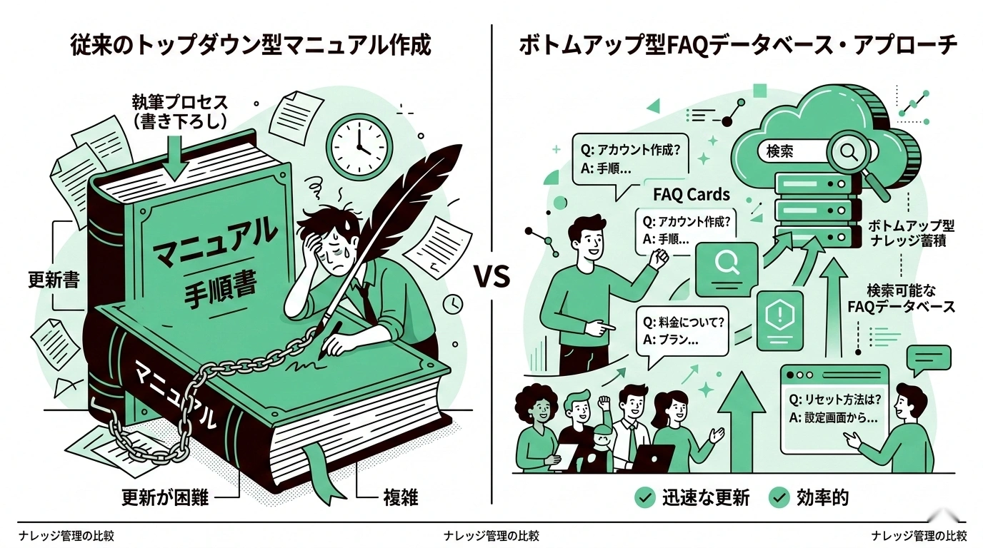 従来のマニュアル作成が「トップダウン型」——つまり最初から体系的な文書を作ろうとするのに対して、FAQデータベース化は**「ボトムアップ型」**です。実際に寄せられた質問と回答を蓄積し、それを検索可能なデータベースにしていくという方法です。