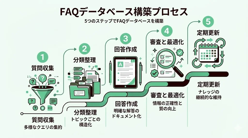 では、具体的にどうやってFAQデータベースを構築すればいいのか。実践的な5つのステップを紹介します。