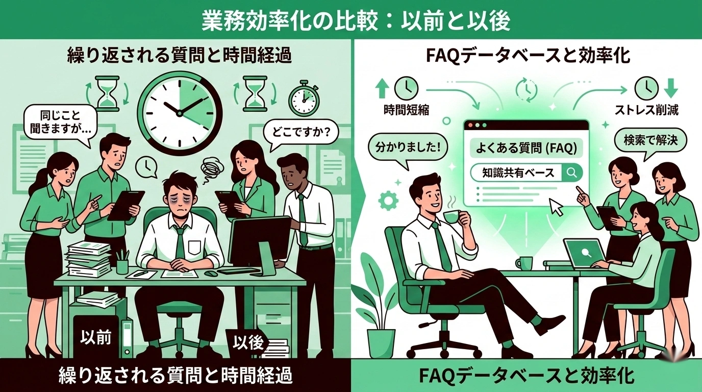 特に属人化が進んだ組織では、「キーパーソンが退職したらどうなるか?」というリスクへの対策としても、FAQデータベース化は有効です。知識が個人から組織に移転されていれば、誰か一人が抜けても業務は止まりません。