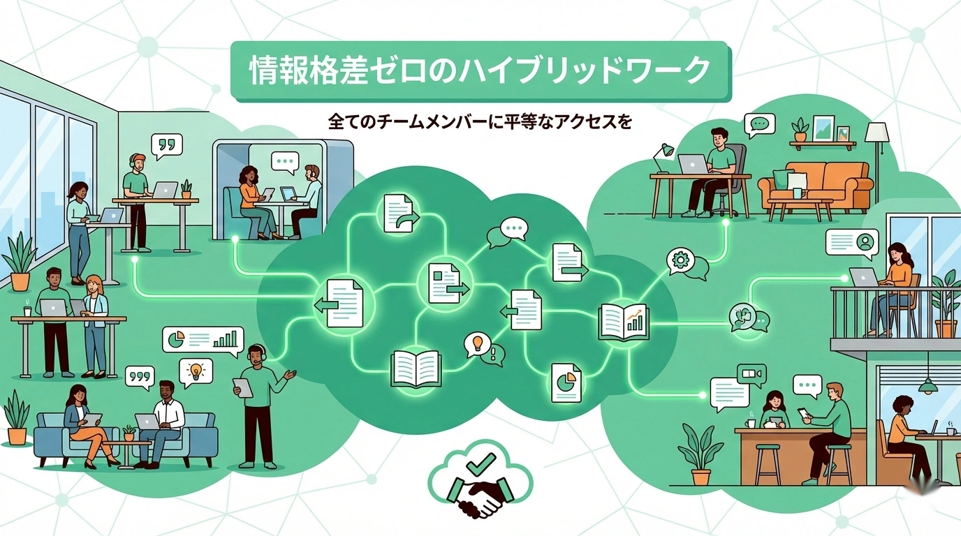 ハイブリッドワーク時代の情報格差は、「出社組が意地悪をしている」わけでも、「リモート側が怠けている」わけでもありません。働く場所が違うだけで、アクセスできる情報の量と質に差が生まれてしまう——これは構造的な問題です。