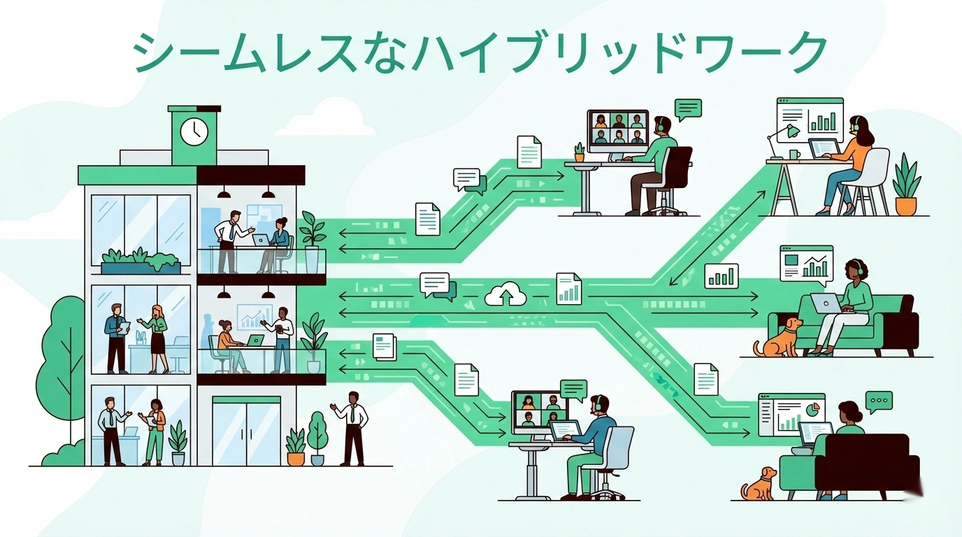 リモートワークと出社を組み合わせたハイブリッドワークが定着した今、こんなやりとりが日常的に起きていないでしょうか。週に数日はテレワーク、残りは出社——柔軟な働き方は社員にとってありがたい制度のはずです。しかしその裏で、出社している人とリモートで働く人の間に、じわじわと「情報格差」が広がっているのが現実です。