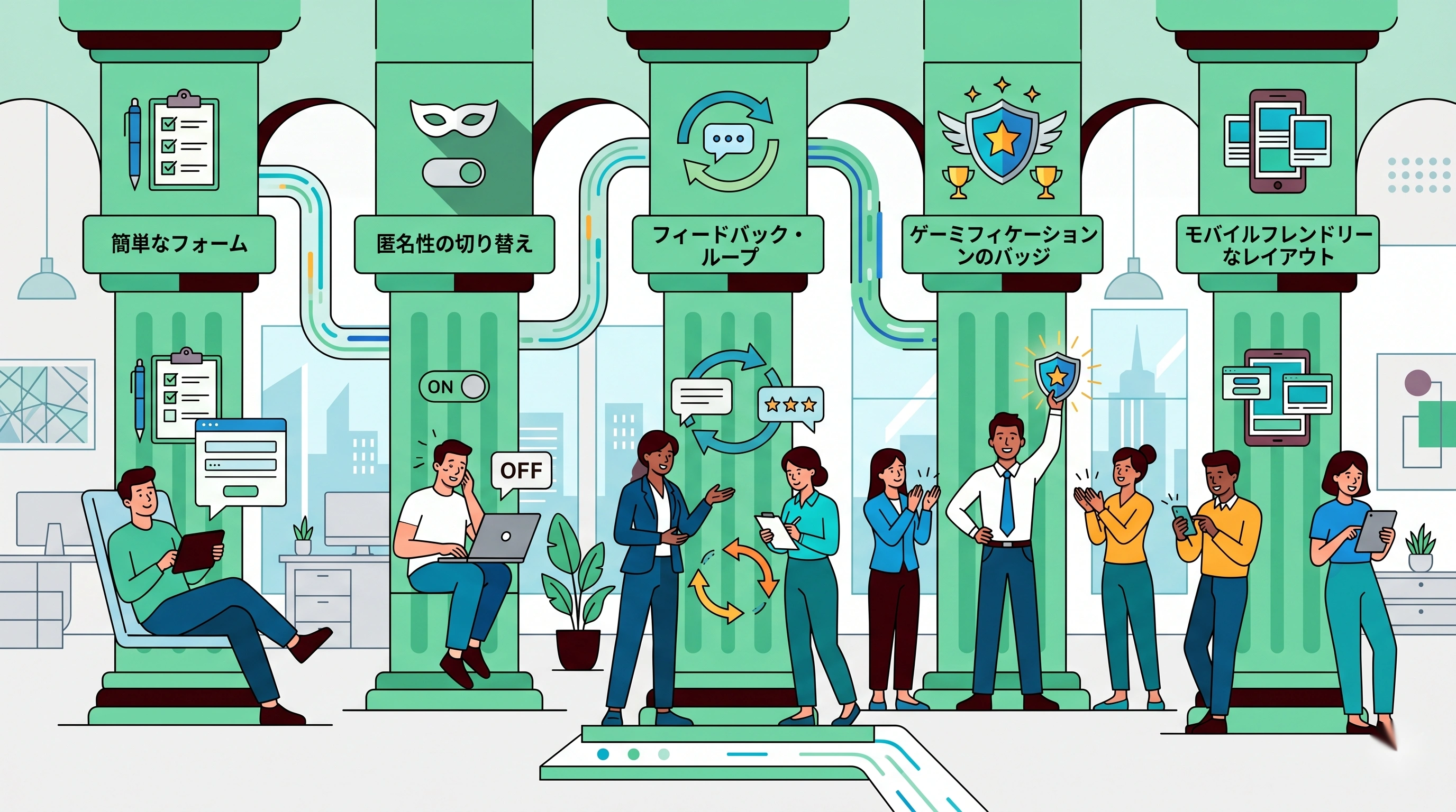 フォームの構造、匿名性のオプション、フィードバック表示、ゲーミフィケーション要素、モバイル最適化——これらは個別の小技ではなく、組み合わせて初めて効果が出る設計群です。読み終えるころには、自社の既存ツールのどこを直せば投稿率が伸びるか、優先順位が見える状態になっているはずです。