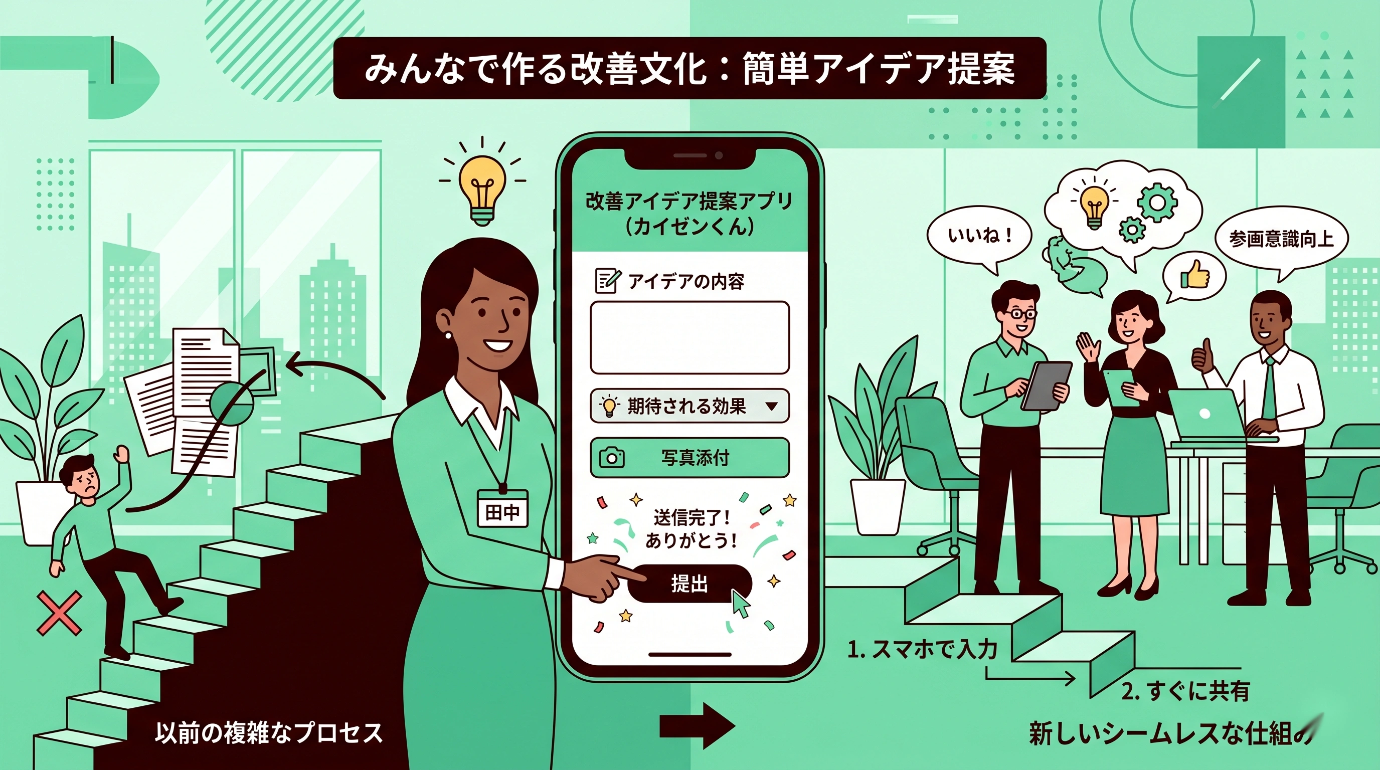 改善提案の投稿率は、社員の意欲ではなくUI/UXで決まります。本記事の要点は次の通りです。