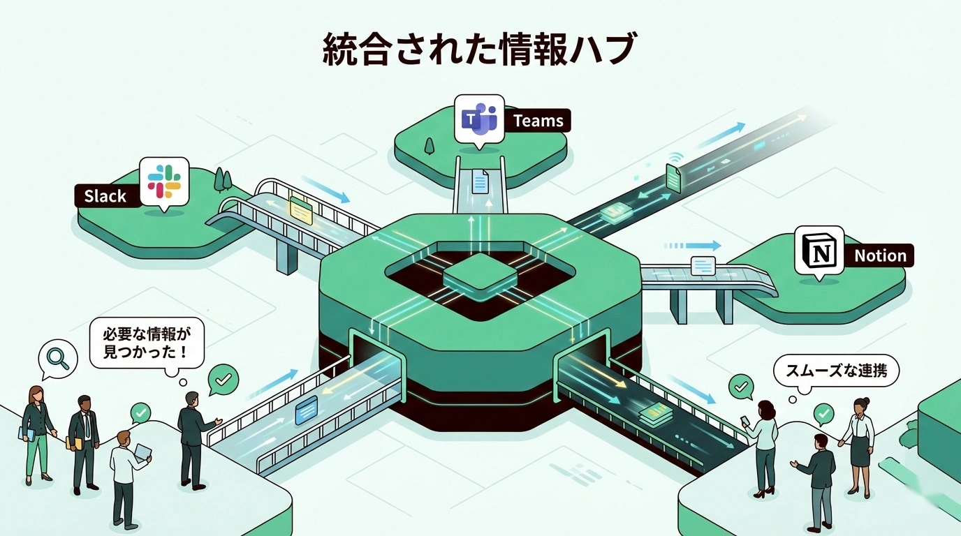 「半年前に誰かが共有してたあの資料」を探すのに30分かかる。どのツールのどのチャンネルにあるのか、手当たり次第に検索。見つからないことも多い。