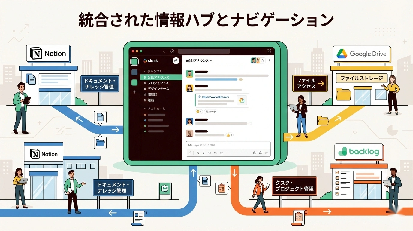 この導線設計により、ツールが複数あっても「Slackから始める」という一点だけ覚えればいい状態になります。
