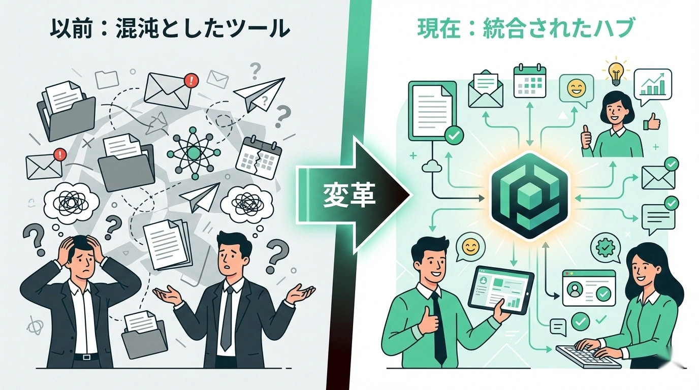 しかし、ツールが増えるたびに**「あの情報、どこにあったっけ?」**という問いが増えていく。結局、Slackで聞く、メールで確認する、会議で「共有お願いします」と頼む——。ツールを入れたのに、コミュニケーションコストが下がっていない。