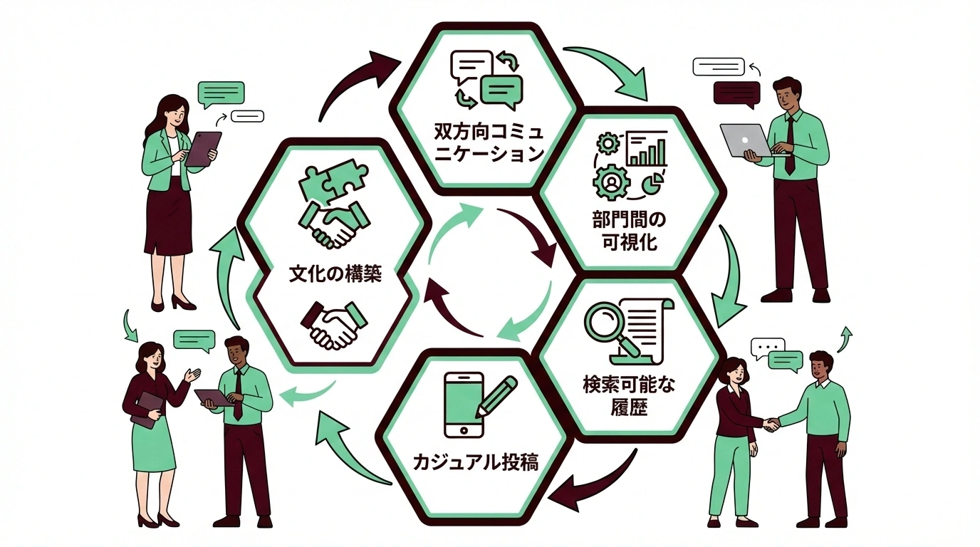 社内SNSを日報として活用する際の鍵は、**「強制しないこと」と「既存ツールと棲み分けること」**です。Slackはリアルタイムのやり取りに、社内SNSは日報とつながり構築に——この使い分けが、ツール疲れを防ぎながら情報共有の質を最大化するポイントです。
