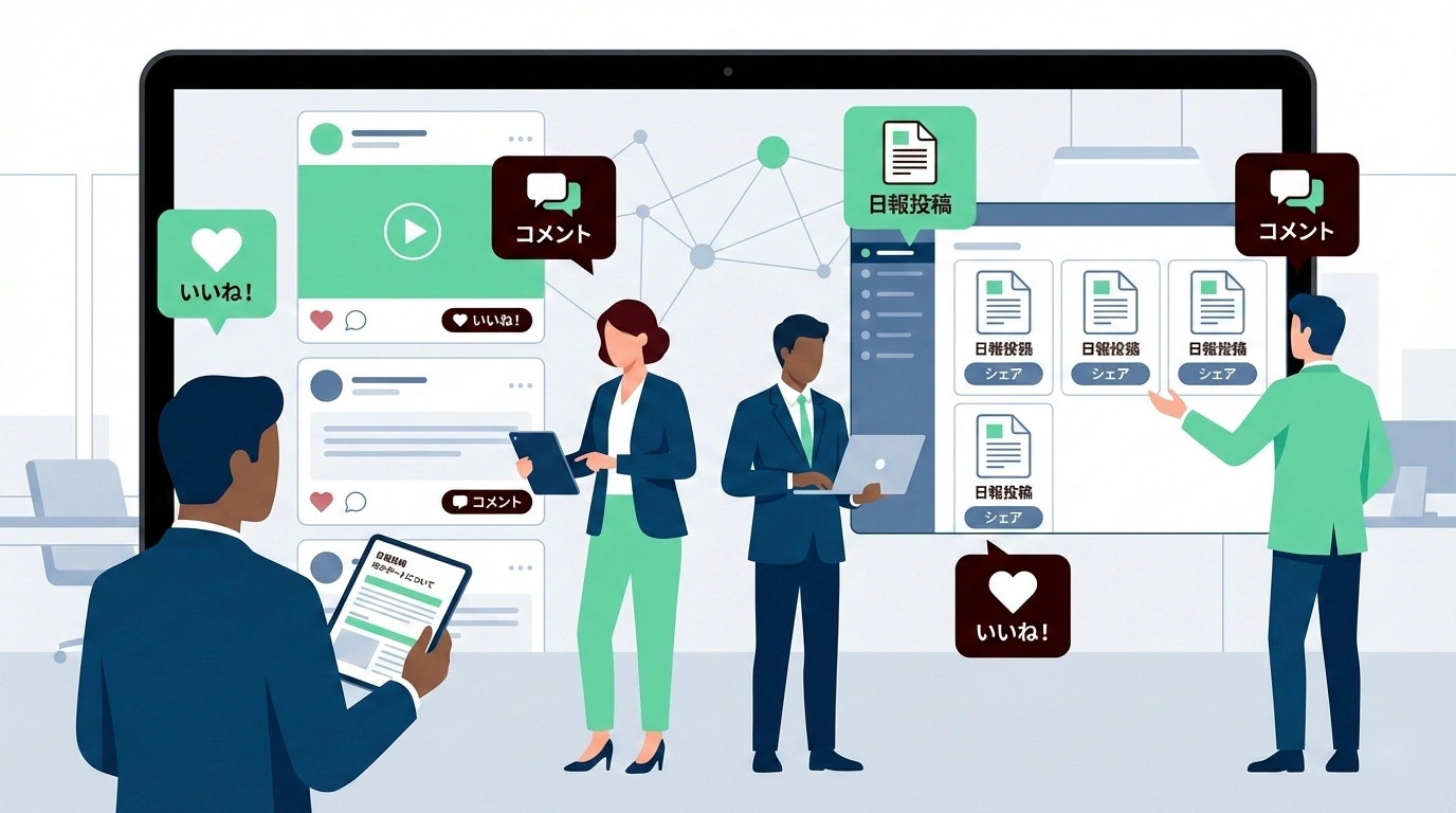 従来の日報が「提出して終わり」だったのに対し、社内SNSでは日報に「いいね」がついたり、同僚から「その案件、うちのチームでも似た経験があります」とコメントが入ったりします。