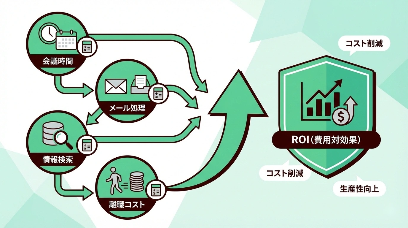 「この情報共有ツールを導入することで、会議の20%——年間約2,400万円分の時間を、本来業務に振り向けられます。ツールの年間コストが300万円だとすると、**ROIは700%**です。」