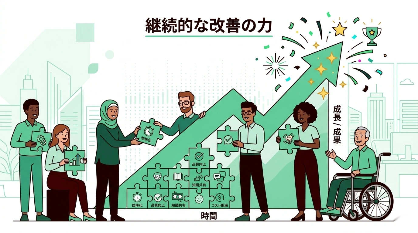 どれも数分で完了する改善です。しかし、こうした小さな改善が10個、50個、100個と積み重なったとき、組織全体の生産性は劇的に変わります。