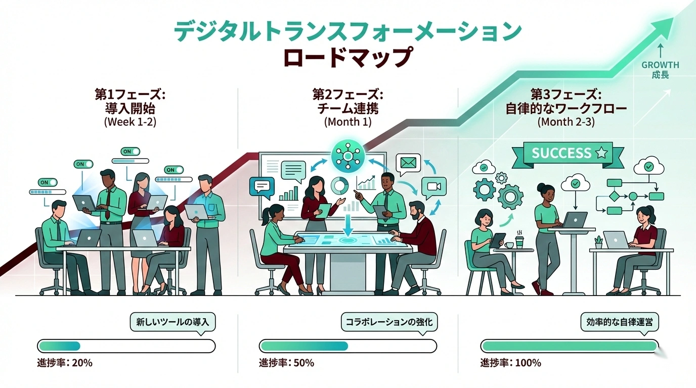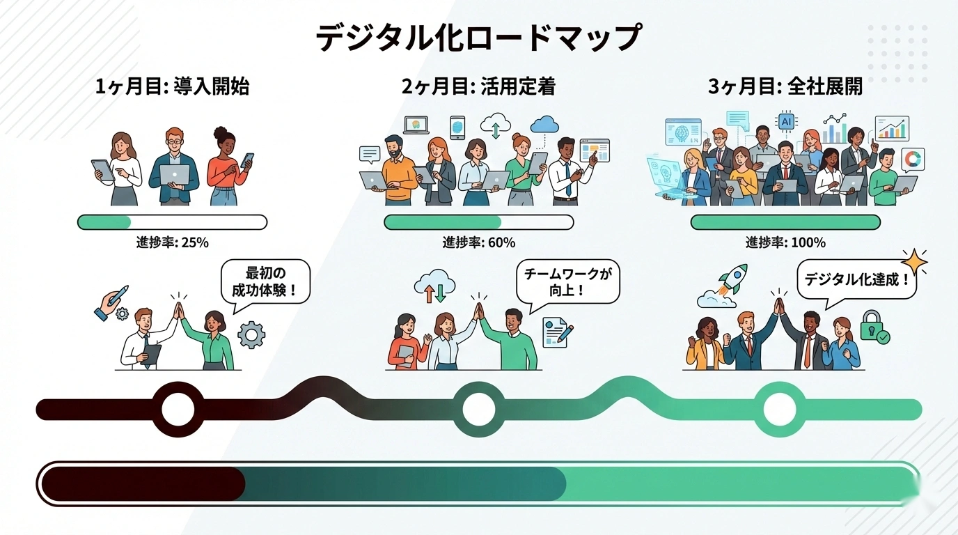 最も大切なのは、ツールを導入した瞬間にゴールテープを切るのではなく、3ヶ月間の定着ロードマップを事前に設計しておくことです。