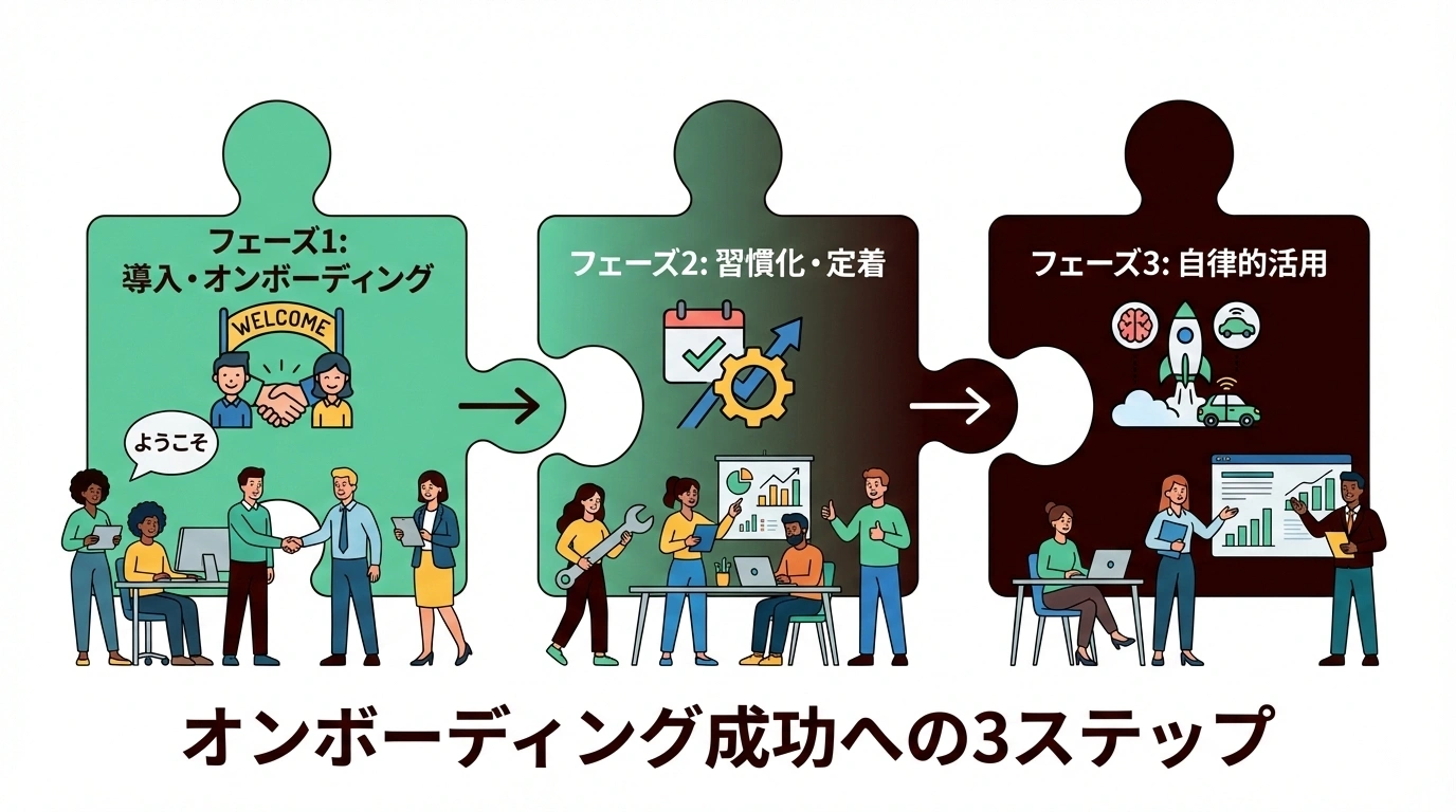 - 定着期(Month 1):業務フローへの組み込み、利用データの可視化、魅力的なコンテンツで「習慣」に変える