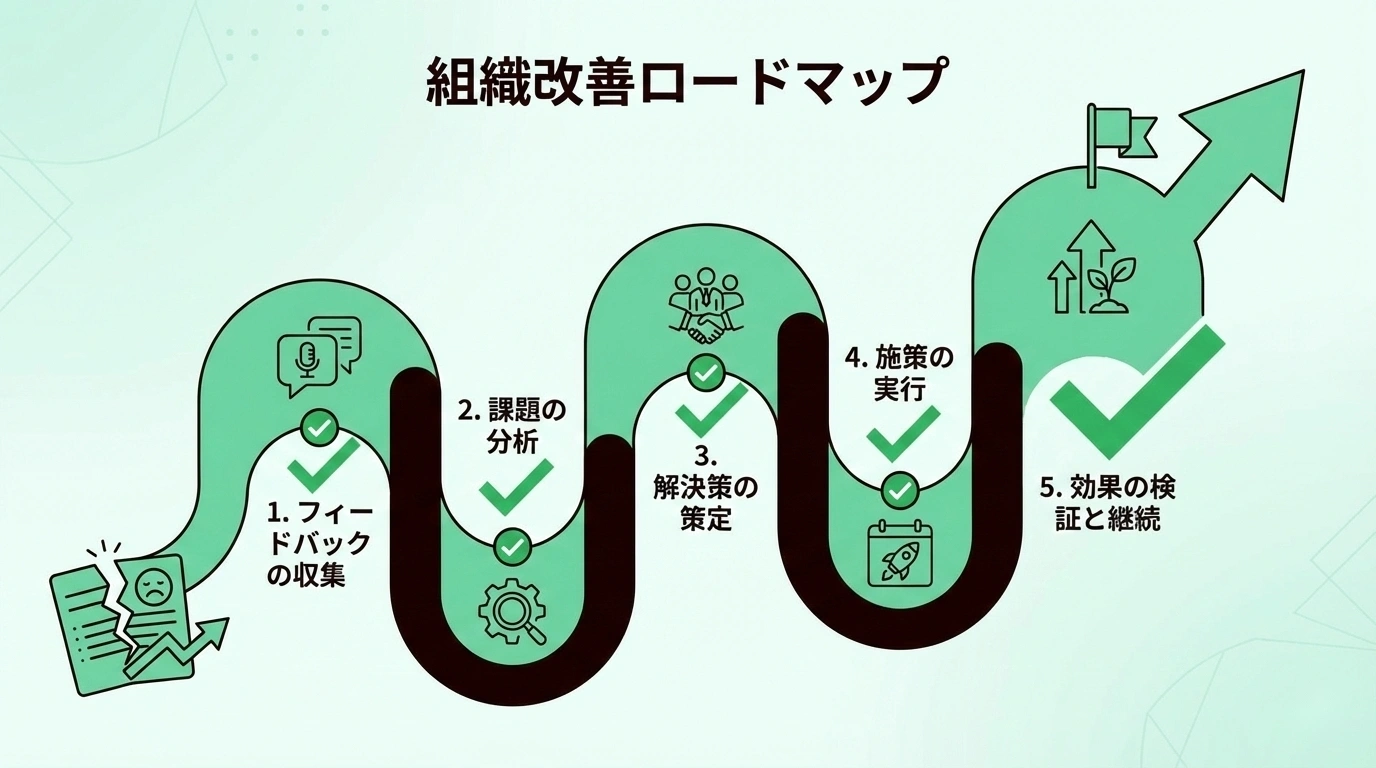 サーベイ結果を受け取ったら、以下の5つのアクションを順番に実行していきましょう。これらは、心理的安全性の向上やエンゲージメント改善に直結する、優先度の高い施策です。