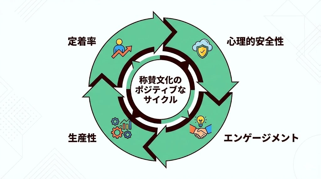 称賛文化が根付いた組織では、離職率が大幅に低下します。人材の流出は採用・教育コストの増大だけでなく、ナレッジの喪失やチームの士気低下にも繋がります。「ここで働き続けたい」と思える組織風土は、企業の競争力そのものです。