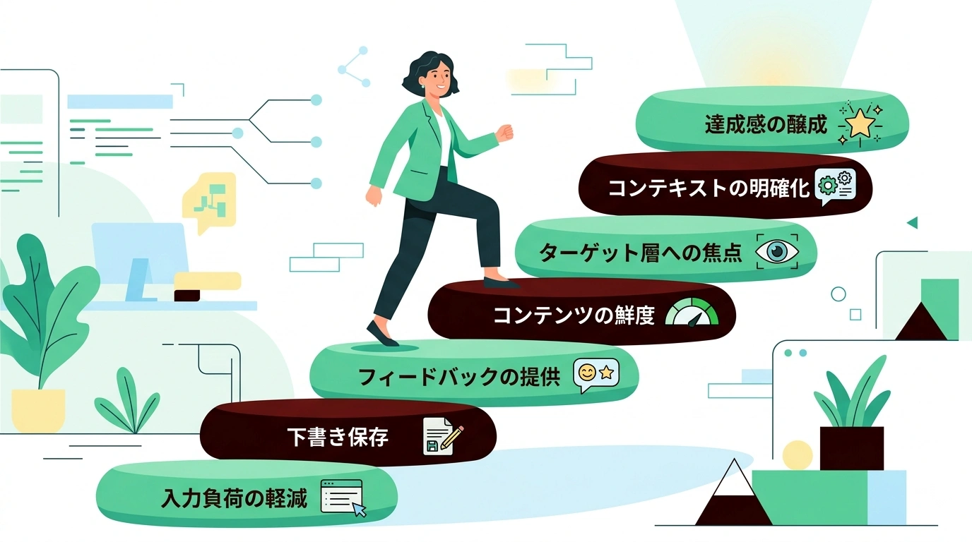ここからは、情報共有における心理的ハードルを下げるための具体的なUI/UXの手法を解説していきます。ポイントは、ユーザーに「頑張らせない」設計です。