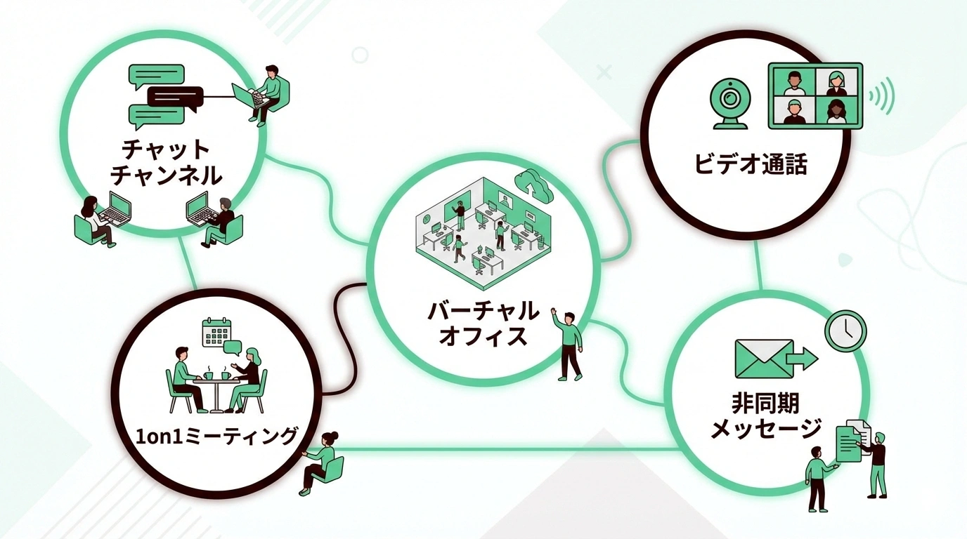 oViceやGatherなどのバーチャルオフィスツールを導入し、オンライン上にオフィス空間を再現する方法もあります。