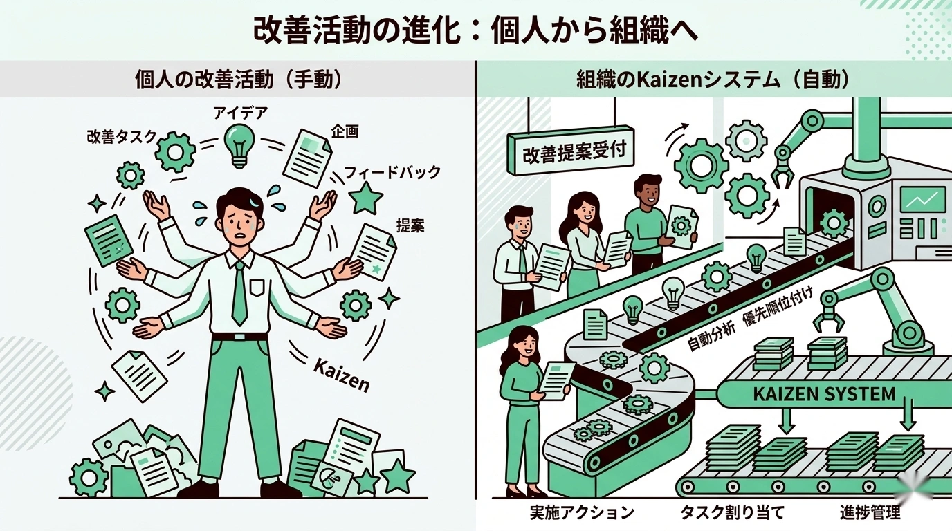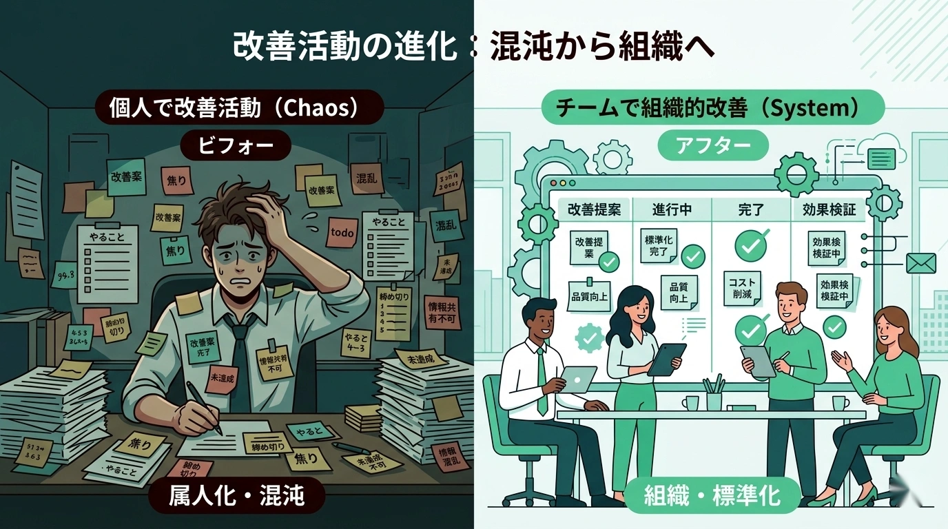 改善が個人の功績ではなく組織の活動として認識されることで、「気づいた人がやる」から「みんなで改善を回す」への文化的シフトが起きるのです。