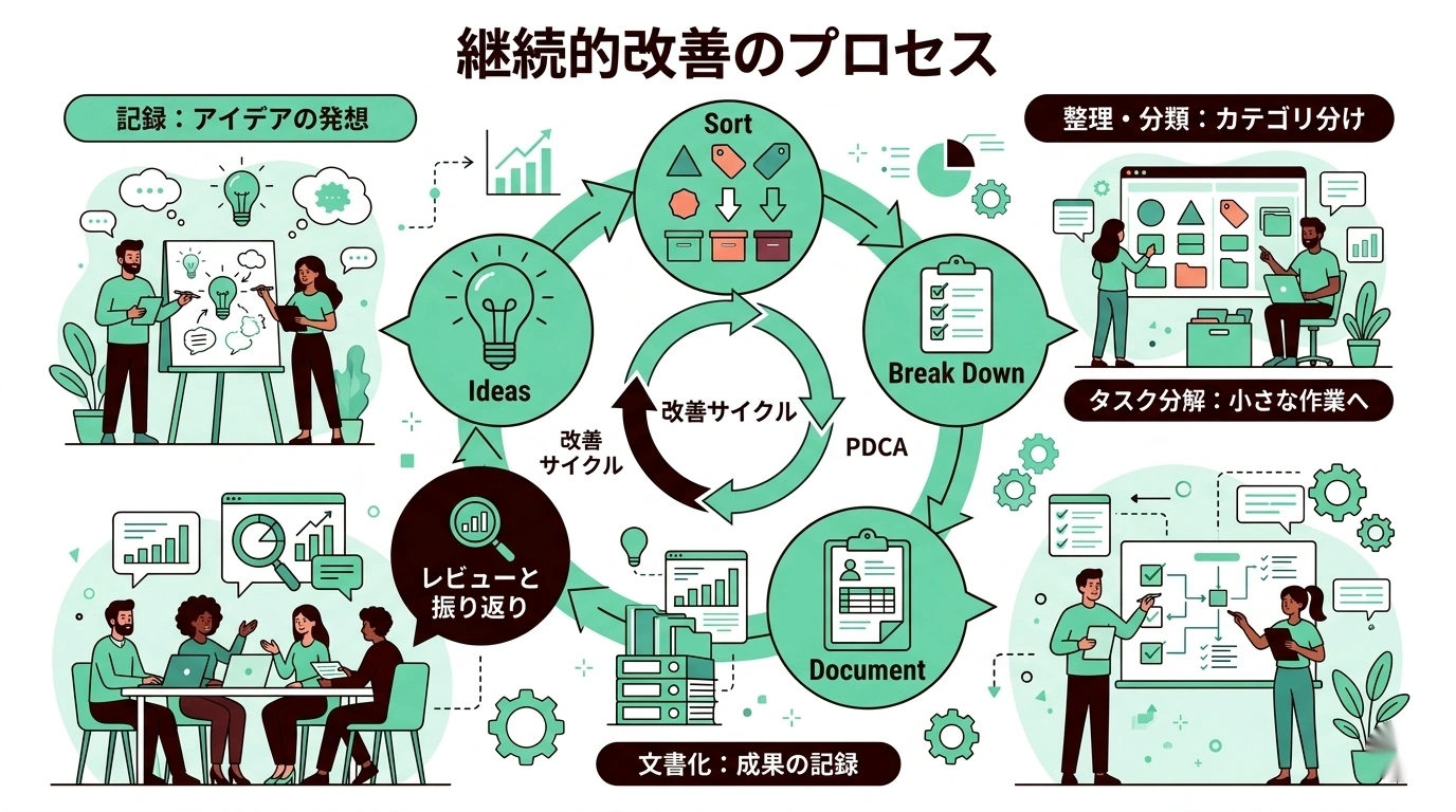 ここからは、個人の善意に頼らず、仕組みとして業務改善を機能させる具体的な方法をお伝えします。ポイントは「改善のプロセスそのものを設計する」ことです。