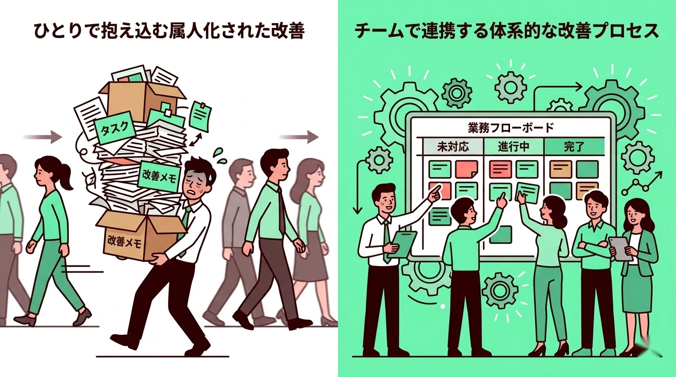 個人の善意ベースの改善には再現性がありません。同じ問題が別のチームで発生しても、改善のノウハウが横展開されない。日報にさえ記録されず、マニュアル作成にもつながらない。組織全体から見れば、同じ問題を何度も個別に解決している状態です。