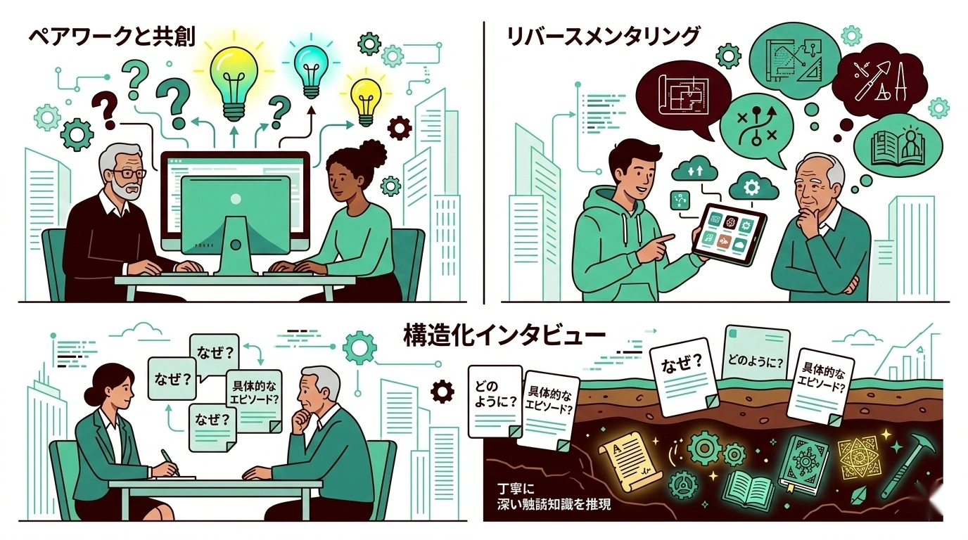 - ペアワーク・逆メンタリングで暗黙知を引き出す——対話から知識を抽出する