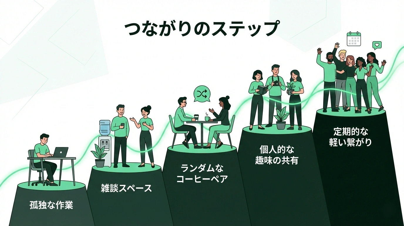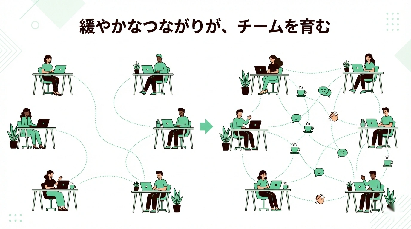 オフィスの廊下で偶然すれ違うような、計画されていない接点——これが「弱い紐帯」を維持する最大の要素でした。リモートワークでは、これを意図的に仕掛ける必要があります。