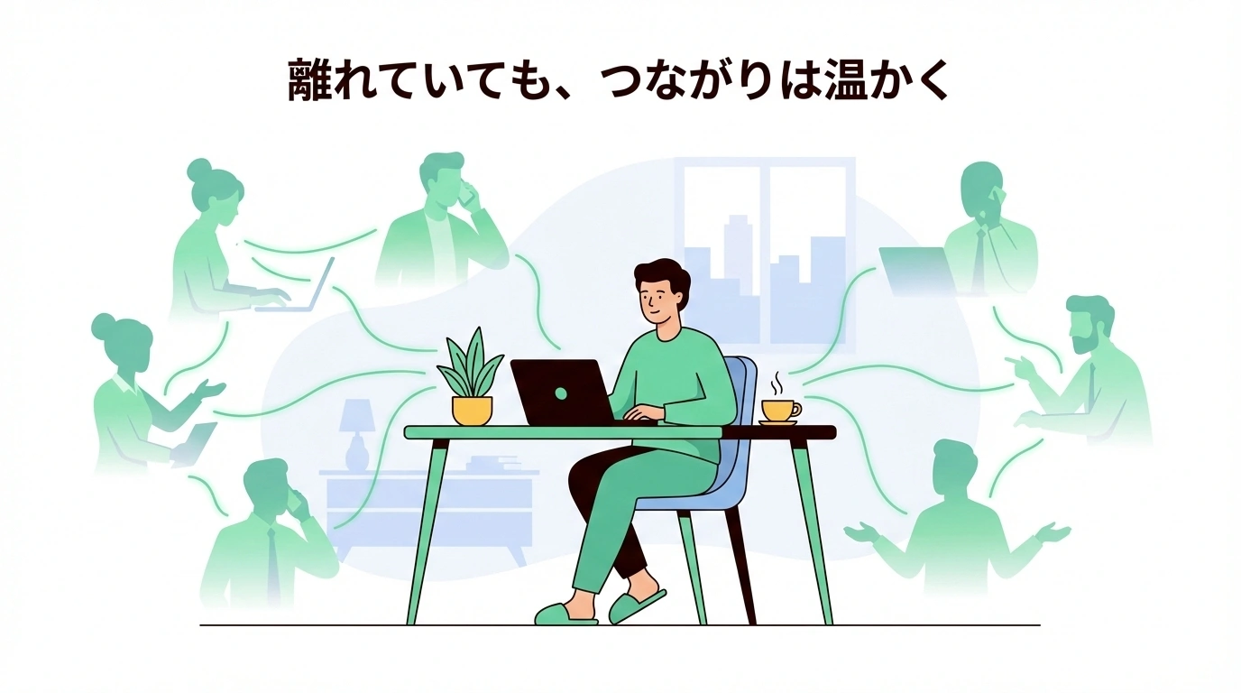 まずは今日、同僚に業務と関係のないメッセージをひとつ送ってみてください。「最近どうですか?」——たったその一言が、テレワークの孤独を溶かす最初の一歩になります。