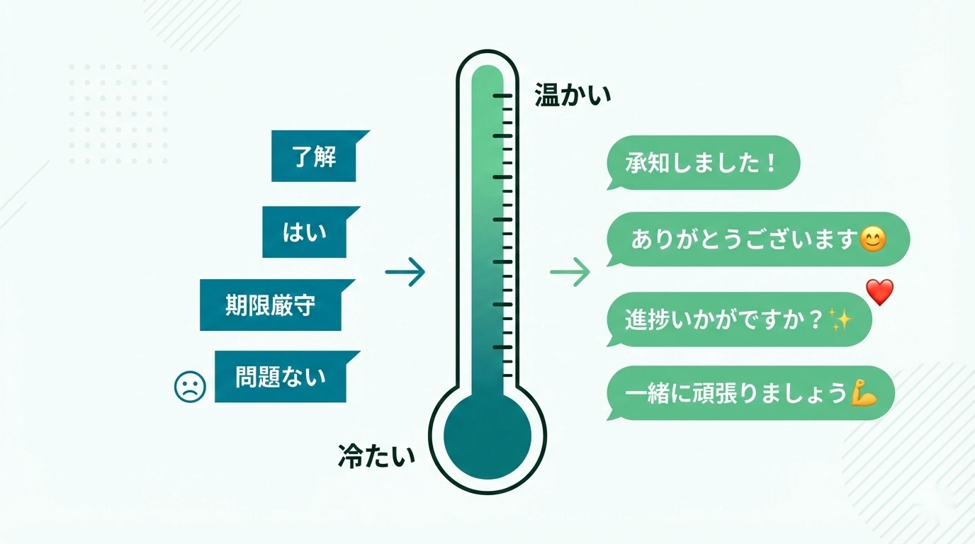 テキストの温度感は、意識ひとつで変えられます。明日のチャットから、まずは返信に「ありがとうございます」を一言添えることから始めてみてください。その小さな一歩が、チーム全体のコミュニケーションを温かく変えていく起点になるはずです。
