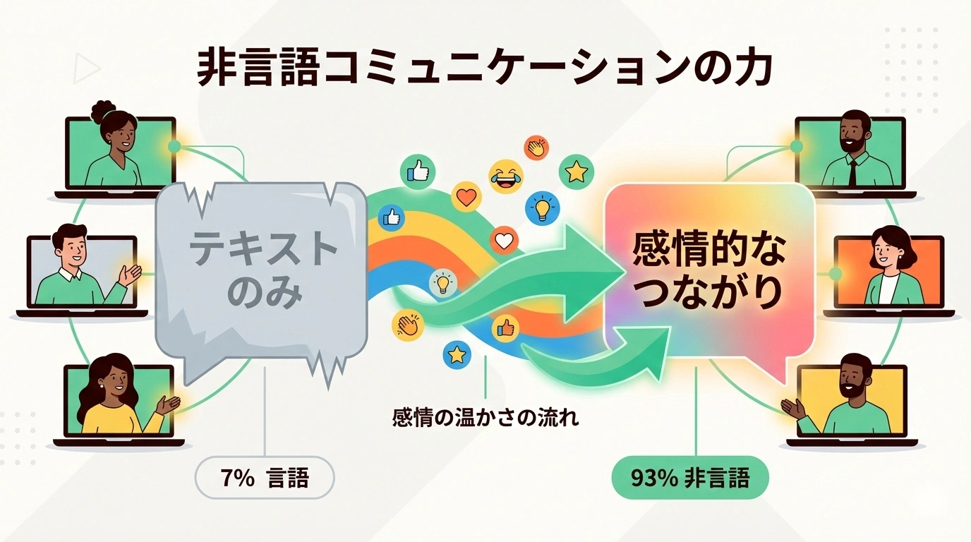リモートワークやテレワークの普及で、私たちのコミュニケーションは大きく変わりました。対面で自然に伝わっていた93%の非言語情報が失われ、テキストだけの「冷たい」やりとりが常態化しています。