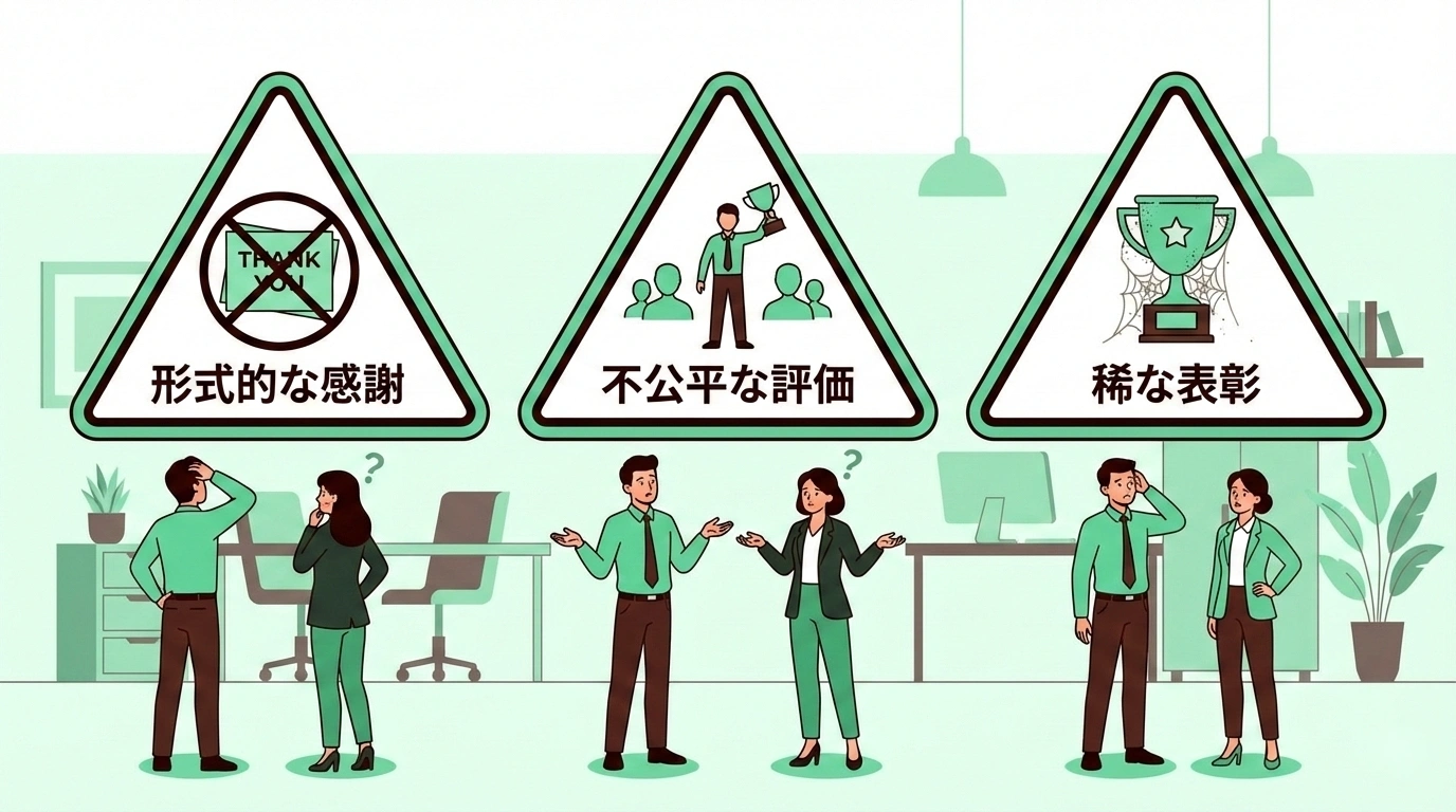 ある調査によると、サンクスカードや社内表彰制度を導入した企業のうち、「期待通りの効果が出ている」と回答した企業は3割程度にとどまるというデータもあります。つまり、7割近くの企業が何らかの課題を抱えているのです。