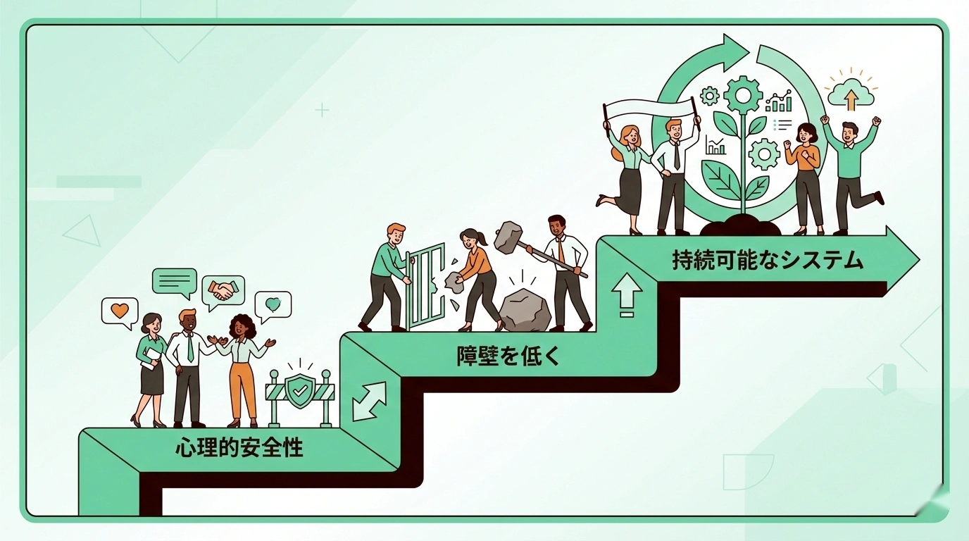 心理的安全性の研究で知られるエイミー・エドモンドソン教授が指摘するように、組織における行動変容は、単に仕組みを導入するだけでは起きません。人が自然と行動したくなる環境づくりが必要なのです。