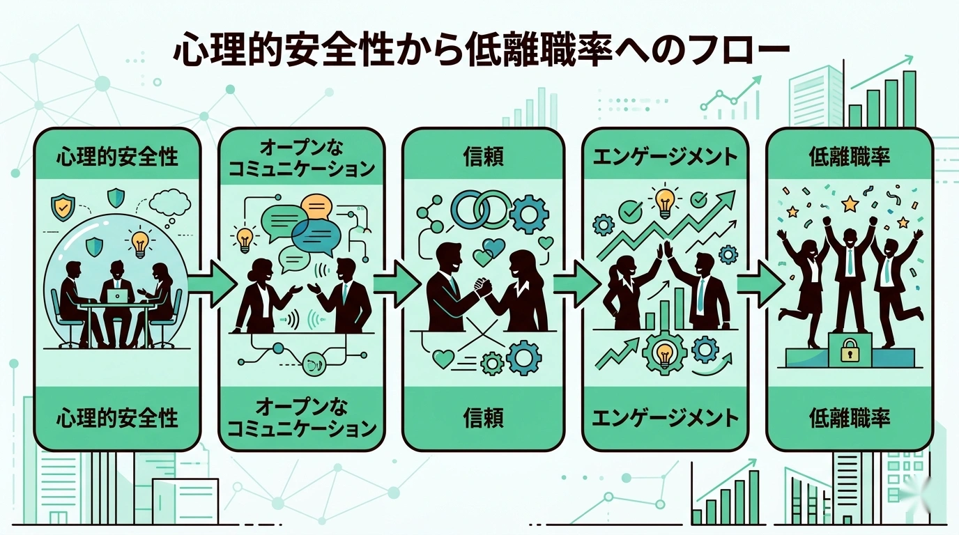 - 心理的安全性は「本音を言える → 問題解決 → 成長実感 → 帰属意識 → 定着」という好循環を生む